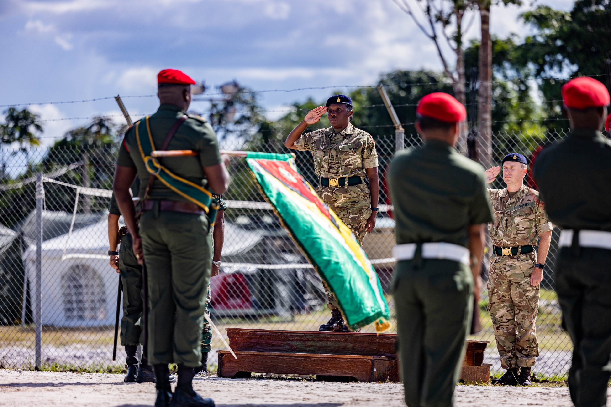 After being greeted by a Guyana Defence Force guard of honor, Ms Lalgie and Mr Weeks toured the base, listened in on lessons and saw troops from the Royal Bermuda Regiment and the Turks and Caicos Islands (TCI) Regiment perform a deliberate attack drill at the camp’s vast firing range.