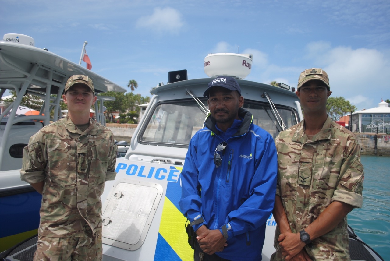 Capt. Gauntlett, who owns Blue Water Divers and has a pilot’s licence, said: “We’re running all the Regiment boats constantly during daylight hours maintaining the integrity of the entrance to Dockyard, particularly with regard to traffic and the race yachts, which have priority. It’s because of my civilian background I was able to do this job.”