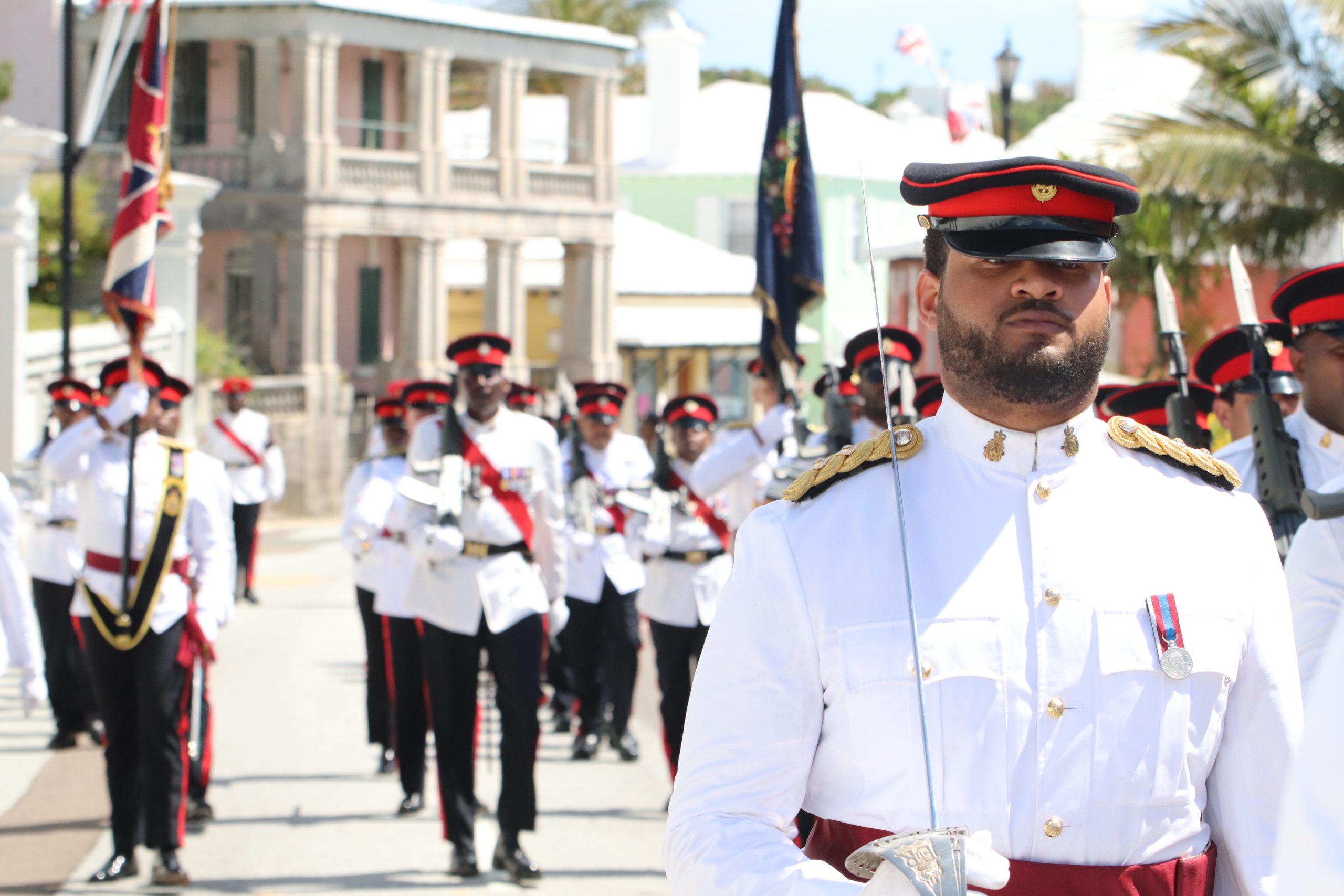 Visitors, residents and dignitaries looked on as about 60 members of the Royal Bermuda Regiment paraded at the traditional Peppercorn Ceremony in St George today.
